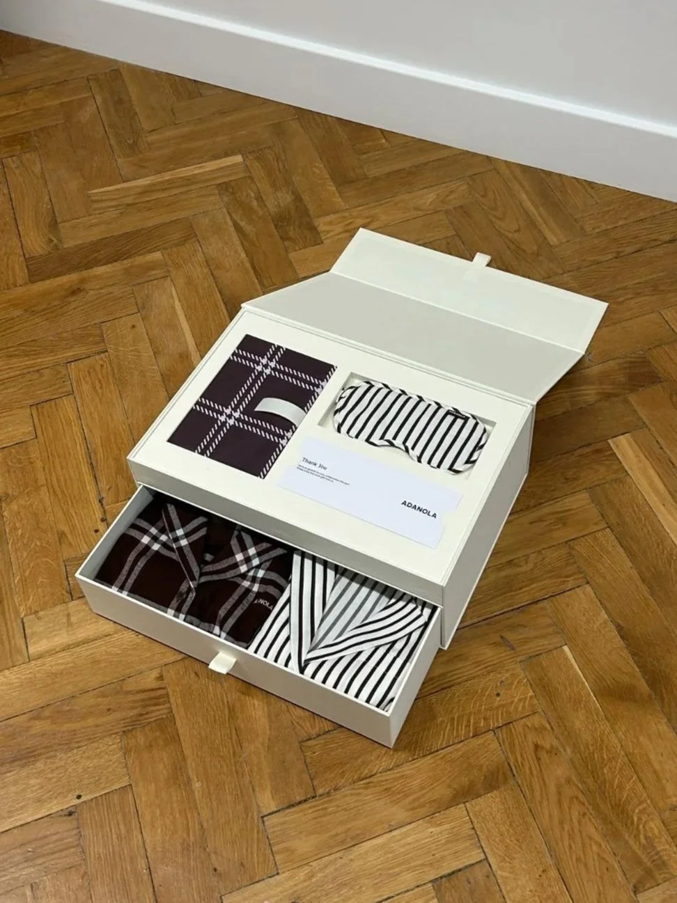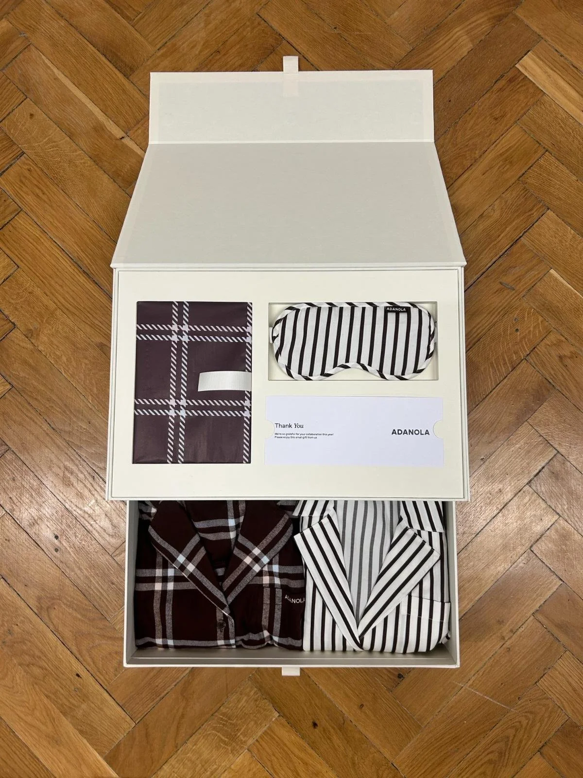 Adanola were looking to create a thoughtful gift box, to be sent to influencers and collaborators, as a way of expressing appreciation for their support over the year. The contents was a set of pyjamas and an eye mask and they needed to be presented in a way that felt luxurious and intentional.